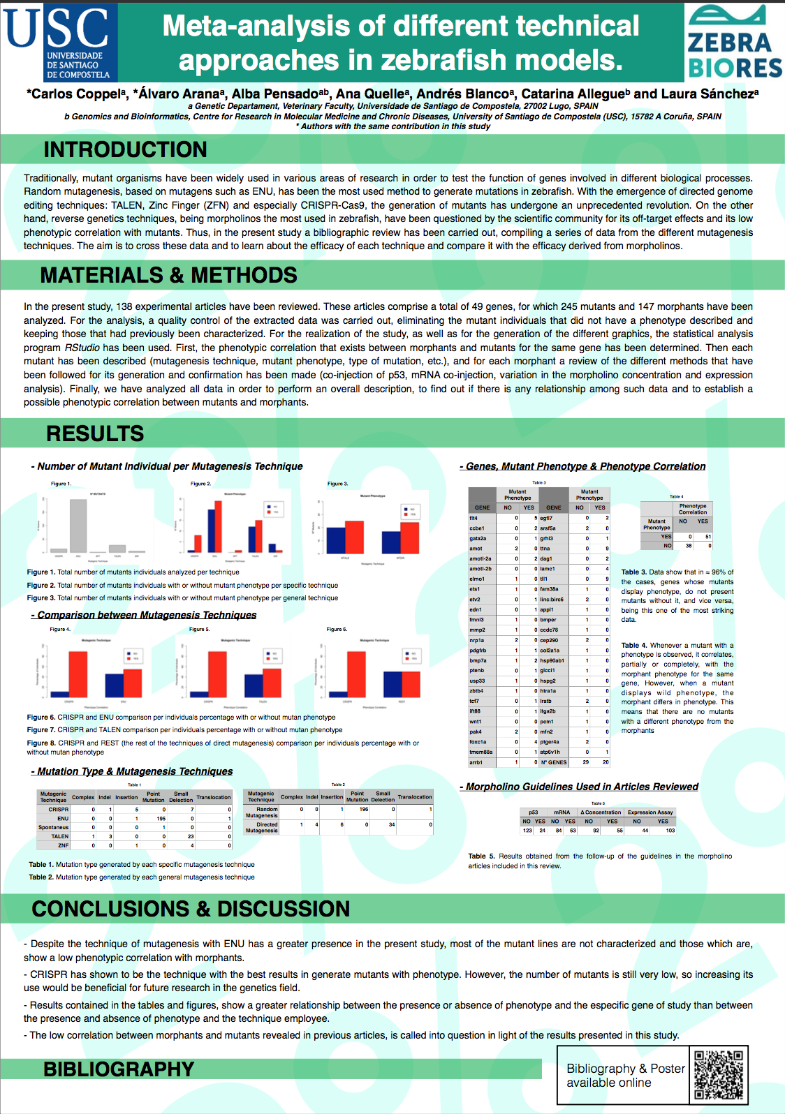 Zebrabiores group attended at the 10th Annual NGS & Clinical Diagnostics Congress in Warsaw, Poland. In this congress, PhD student Carlos Coppel, PhD student Alvaro Arana, PhD student Alba Pensado, PhD student Ana Quelle, PhD student Andrés Blanco presented a poster titled "Metaanalysis of different technical approaches in zebrafish models”.